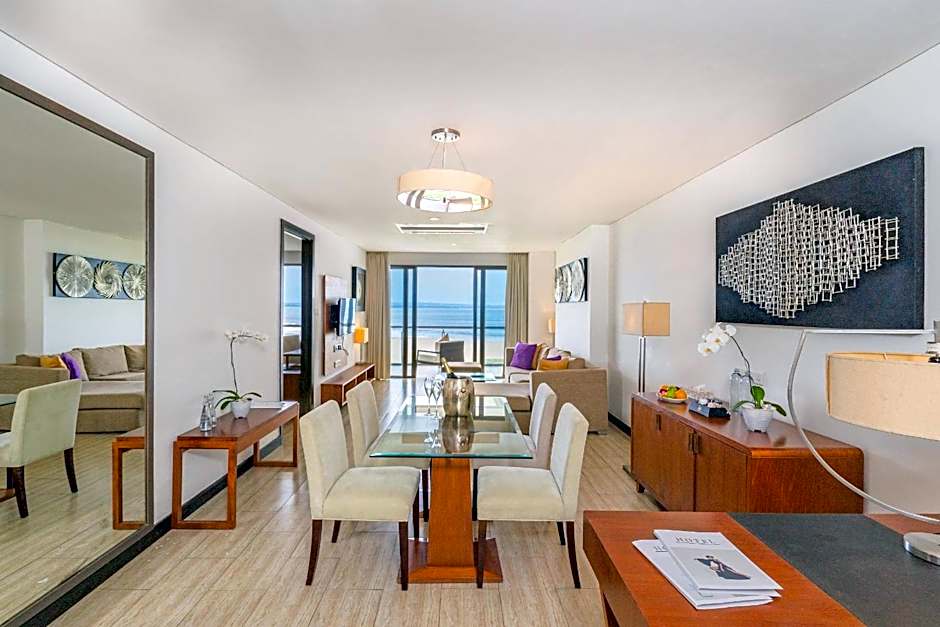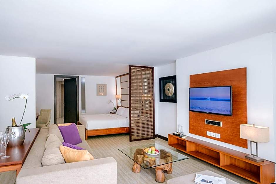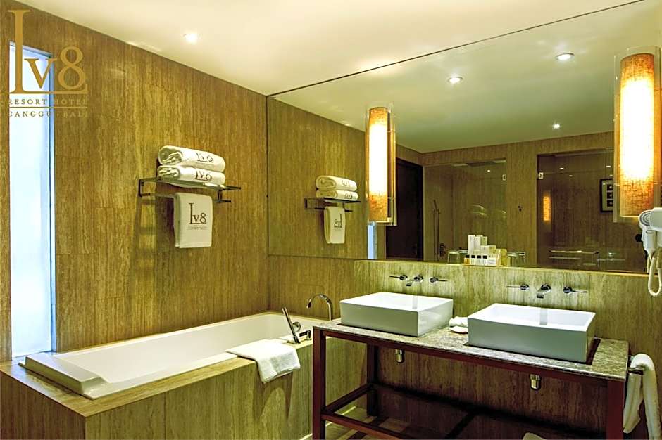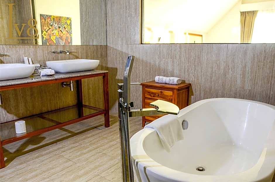 The rooms at Lv8 Resort Hotel are designed to provide ample space and comfort, featuring a cosy seating area and offering views of either the lush tropical gardens or the expansive sea. Modern conveniences include flat-screen TVs with cable channels and minibars, while the private bathrooms are equipped with separate bathtubs, showers, and complimentary toiletries. Select suites offer additional space and a private plunge pool for an extra touch of luxury.